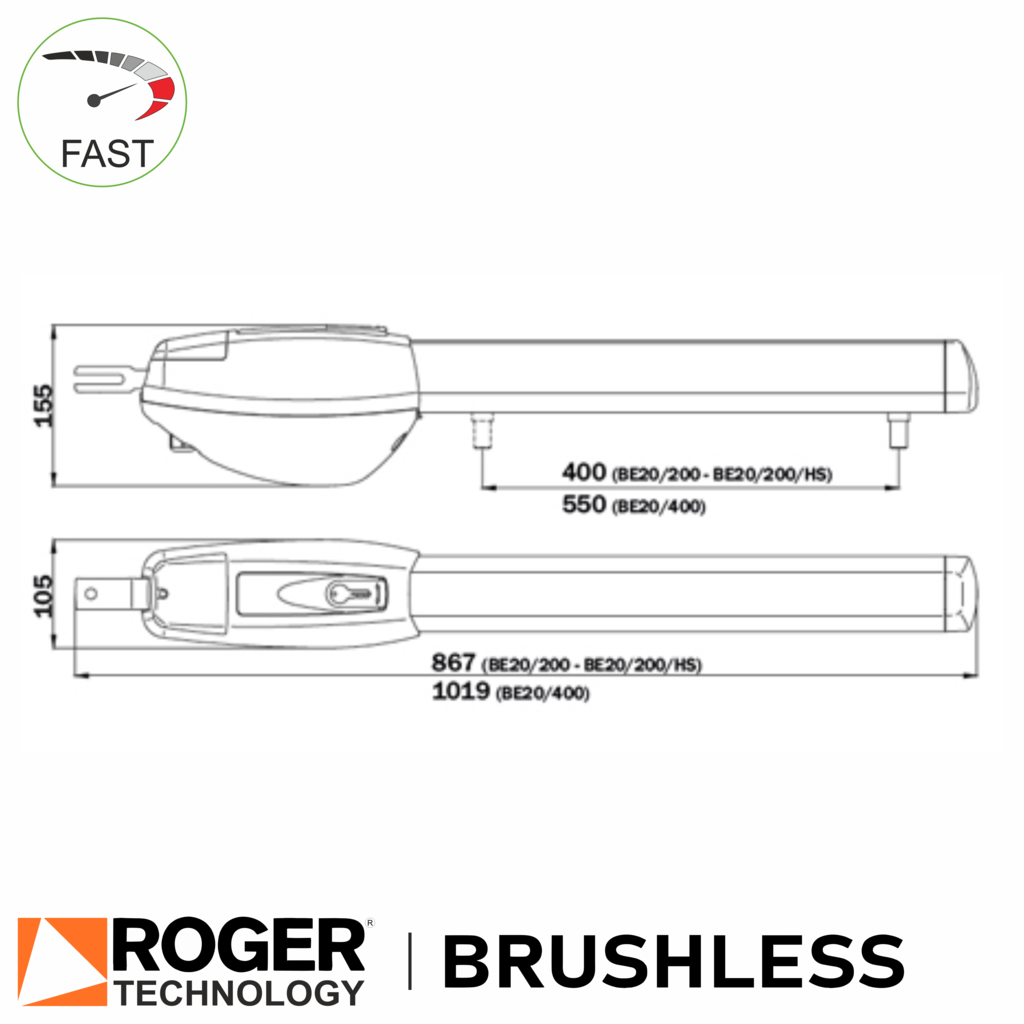 Swing gate motor. This Roger Technology BE20/200/HS brushless electric fast swing gates motor for residential, industrial, or multi-residence electric gates is ideal for new electric gates automation, existing gates automation, upgrade, or replacement.